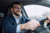 Close-up of a smiling man in business attire driving a car, wearing glasses and a seatbelt. A white square overlay highlights his face, suggesting facial recognition or driver monitoring technology.